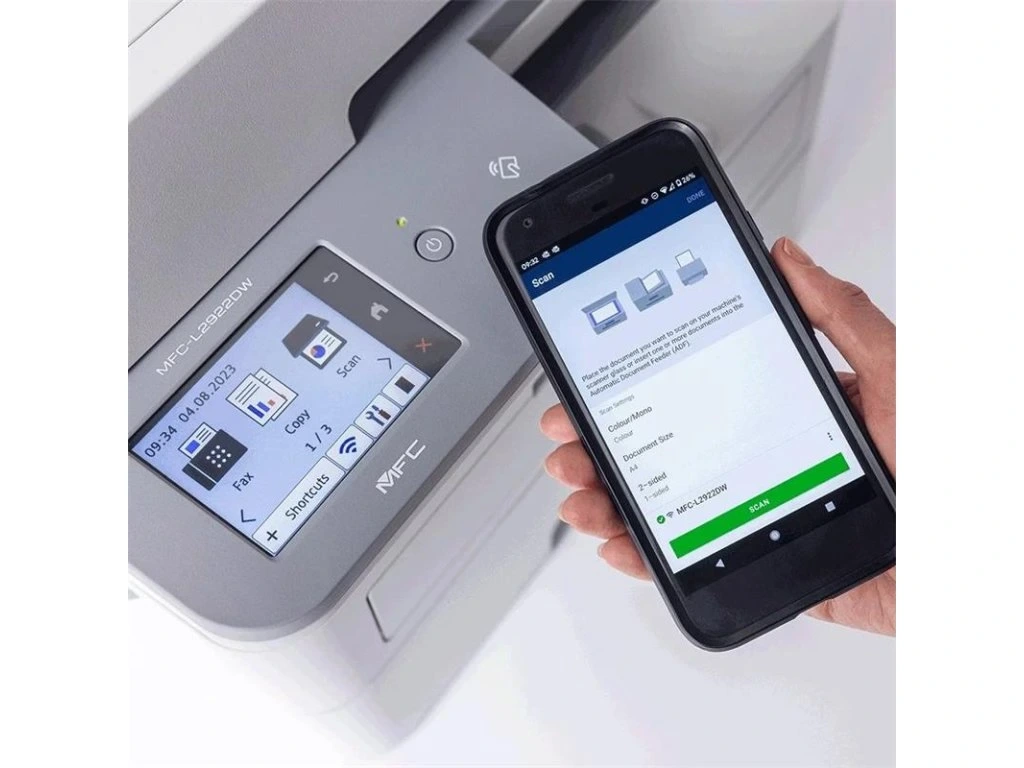 Zariadenie MFC-L2922DW je navrhnuté s cieľom zefektívniť prácu, a preto ponúka vysokú rýchlosť tlače až 34 strán za minútu, automatickú obojstrannú tlač a automatický podávač dokumentov na 50 listov na vytváranie obojstranných kópií a skenov. Vytlačte a skenujte do populárnych cloudových služieb, ako sú Dropbox, Google Drive™, Evernote, OneNote a ďalšie, pričom na tento účel používajte iba dotykovú obrazovku s uhlopriečkou 6,8 cm.