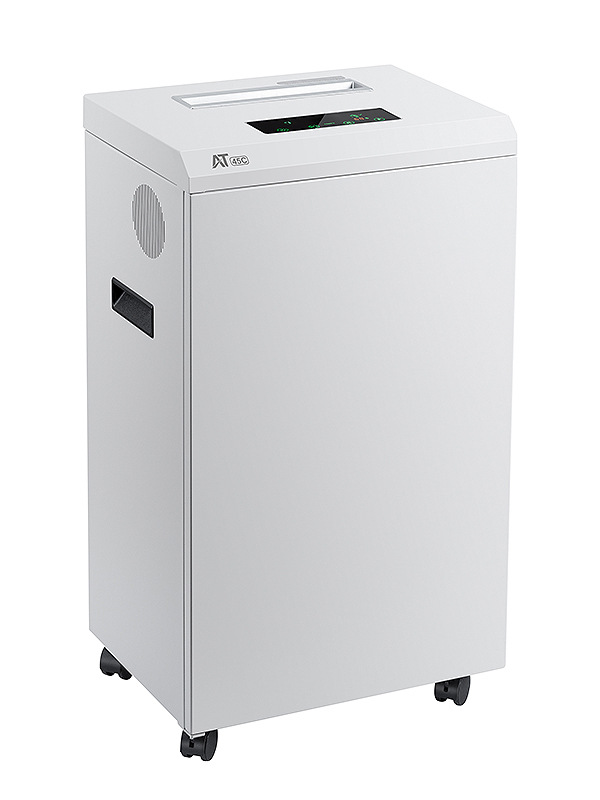 Skartovací stroj AT45C - rezom 4 x 40 mm, skartuje papier, svorky, spinky, CD a platobné karty, kapacita (listov 70g/m2): 18 listov, objem koša: 45l, stupeň utajenia podľa GDPR: p4 – formuláre a tlačoviny s osobnou adresou.